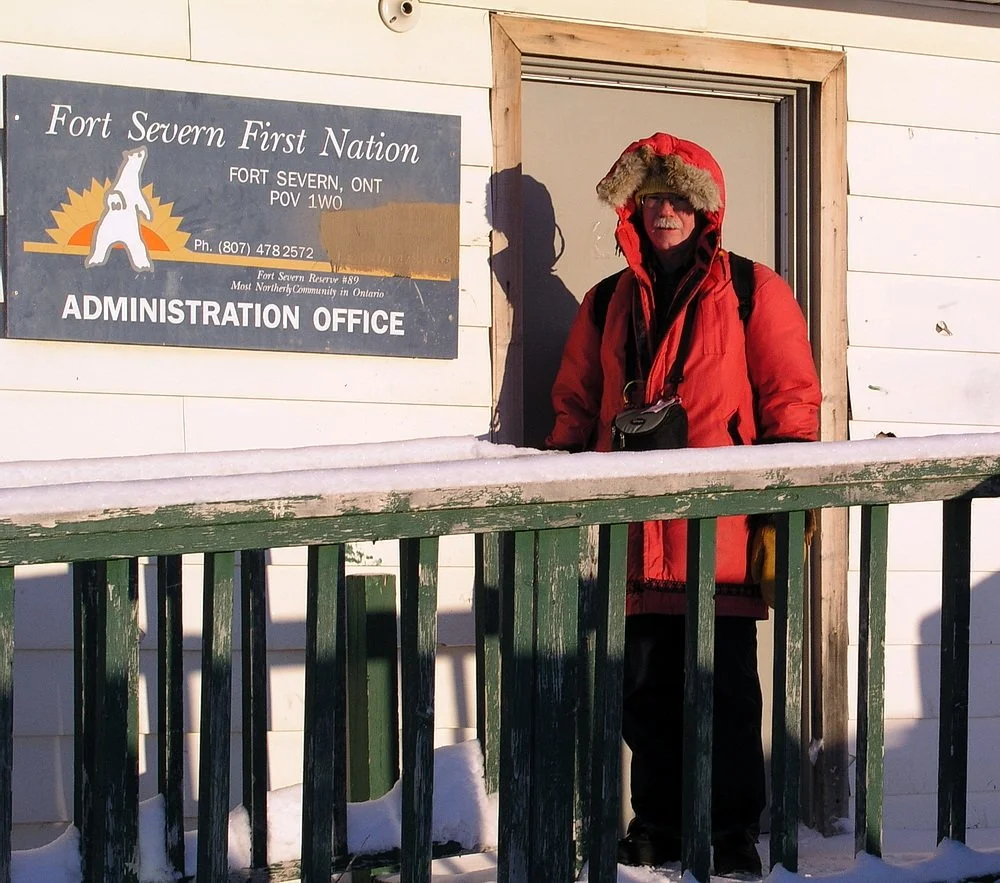 Local transportation in a far north community can be unusual and may include helicopters. In front of the helicopter: I (Andy Fyon) stand on the left in my red parka. Composed in Moosonee, Ontario, in the homeland of Moose Cree First Nation, on James Bay, December 9, 2005.